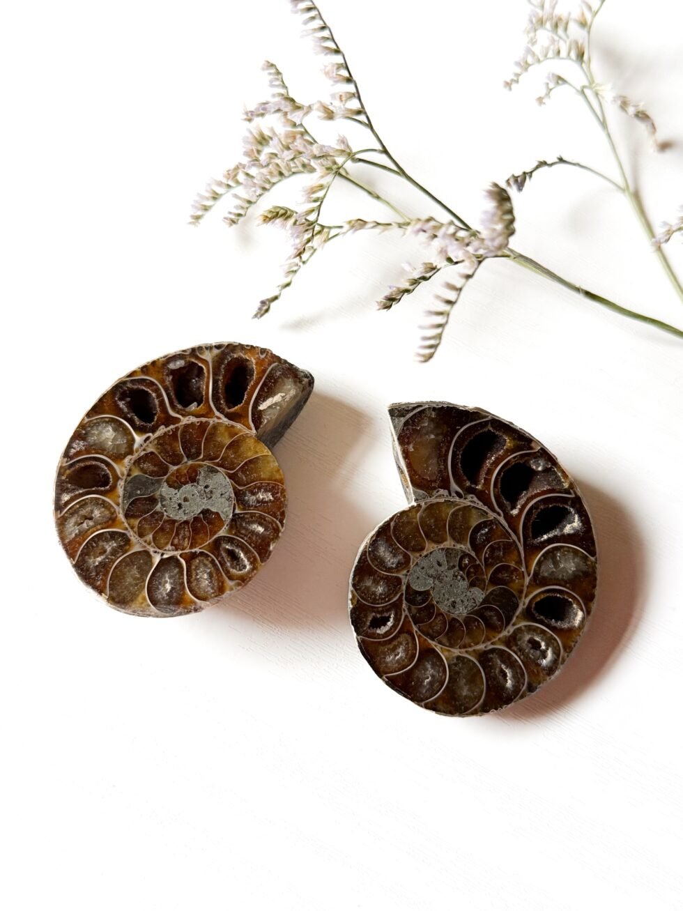 A naturally spiraled ammonite pair symbolising transformation, grounding, and deep connection to ancient energies.