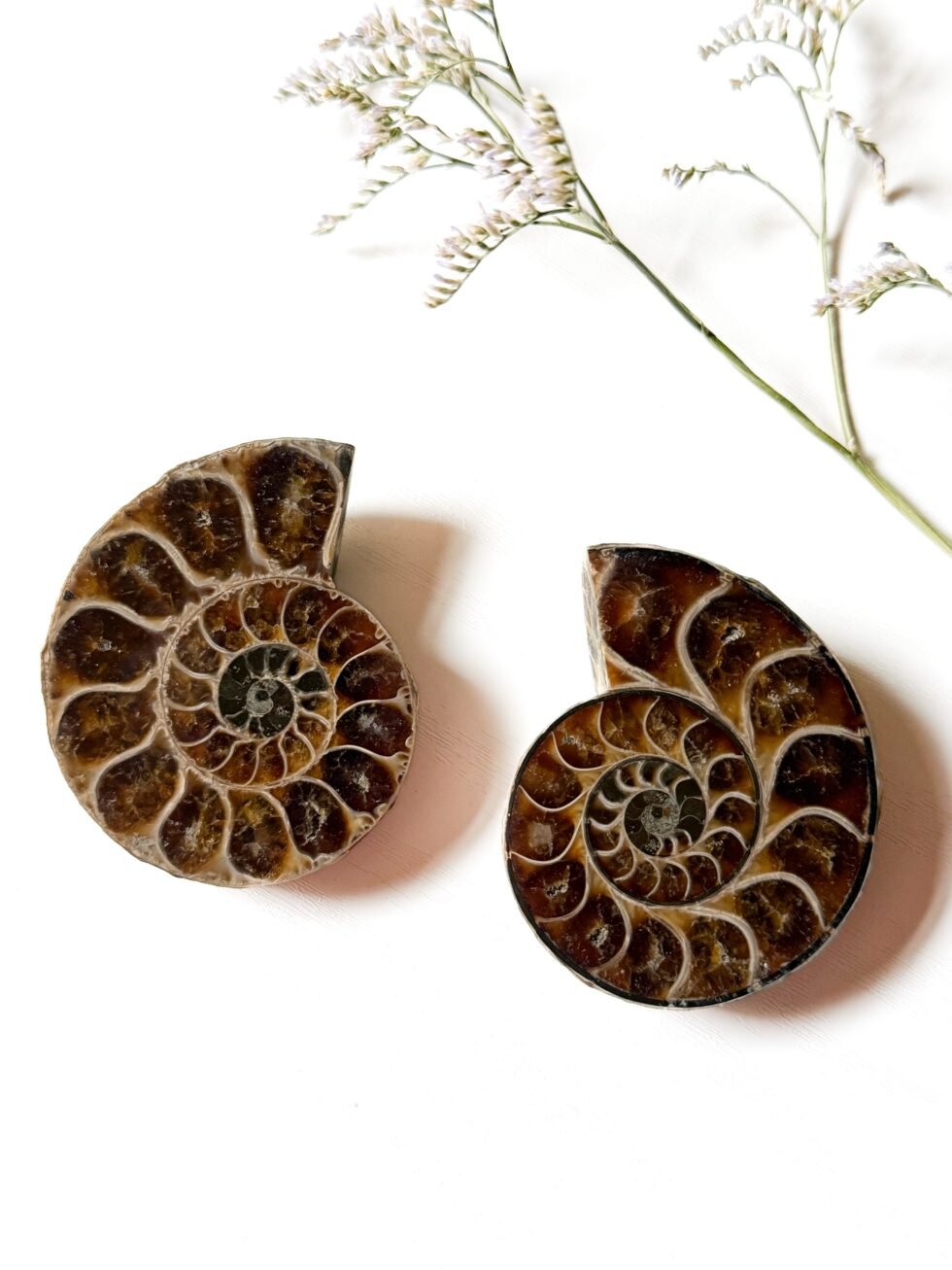 A naturally spiraled ammonite pair symbolising transformation, grounding, and deep connection to ancient energies.