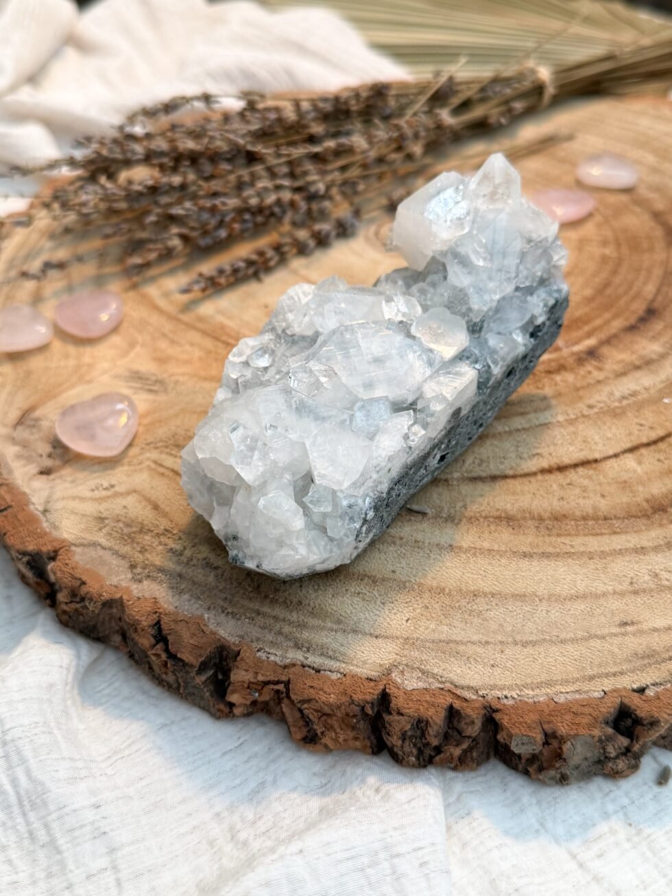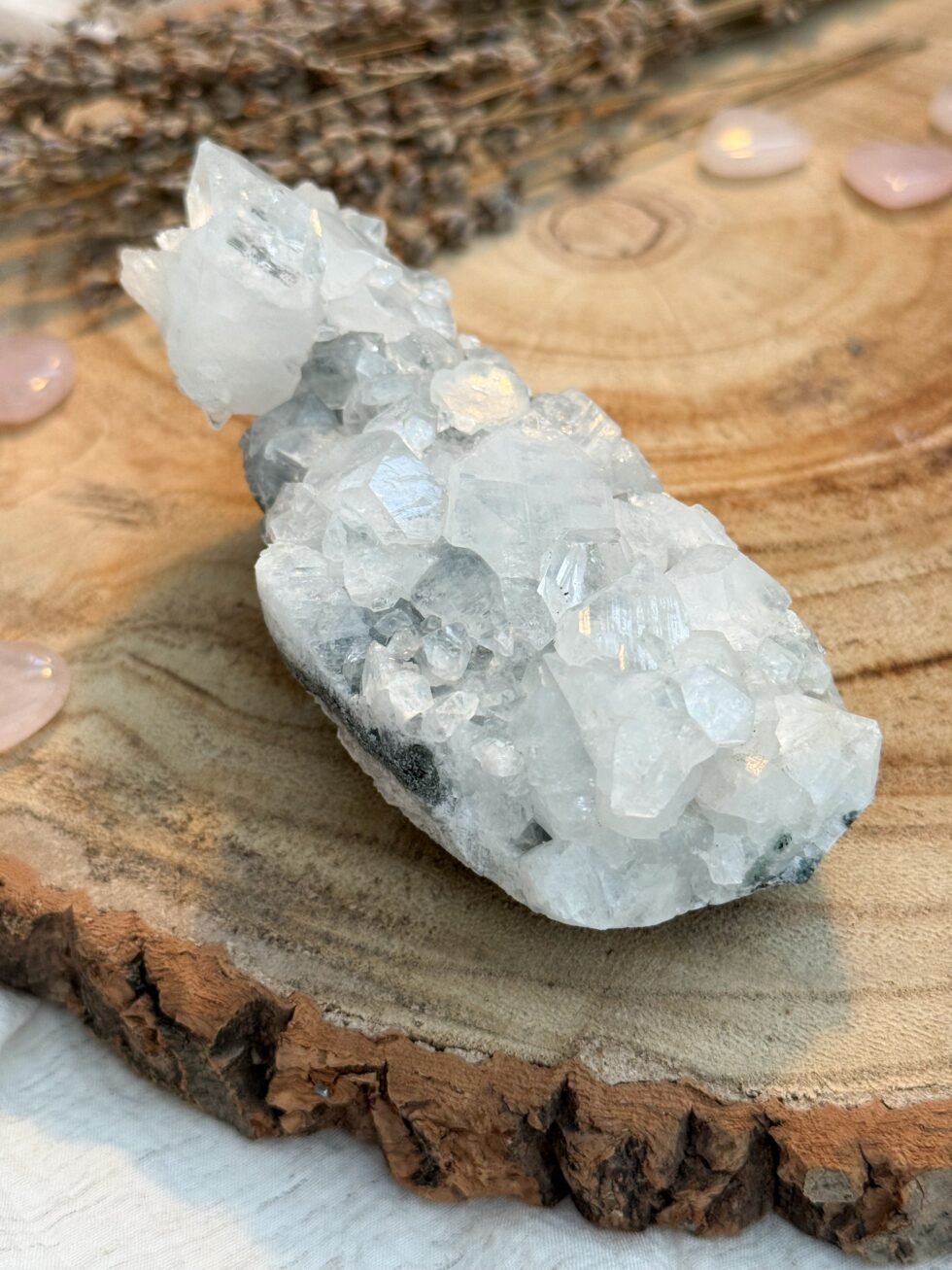 Apophyllite is known for its bright, uplifting energy that clears the mind and opens the heart. With its shimmering natural points and reflective surfaces, this crystal radiates purity and calm. It is often used to bring emotional clarity, ease heaviness, and support deeper connection with intuition and inner peace.