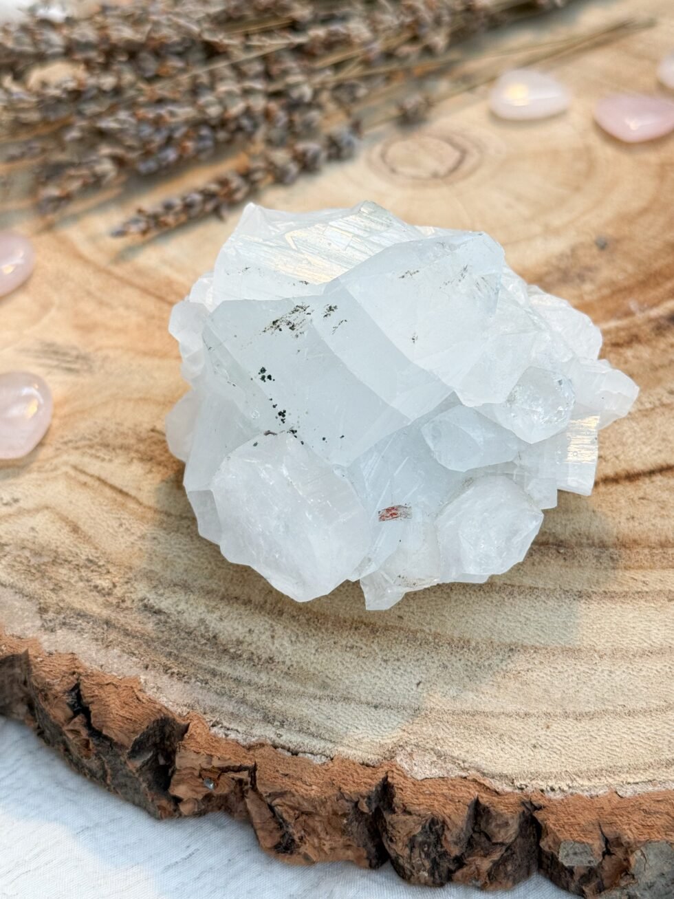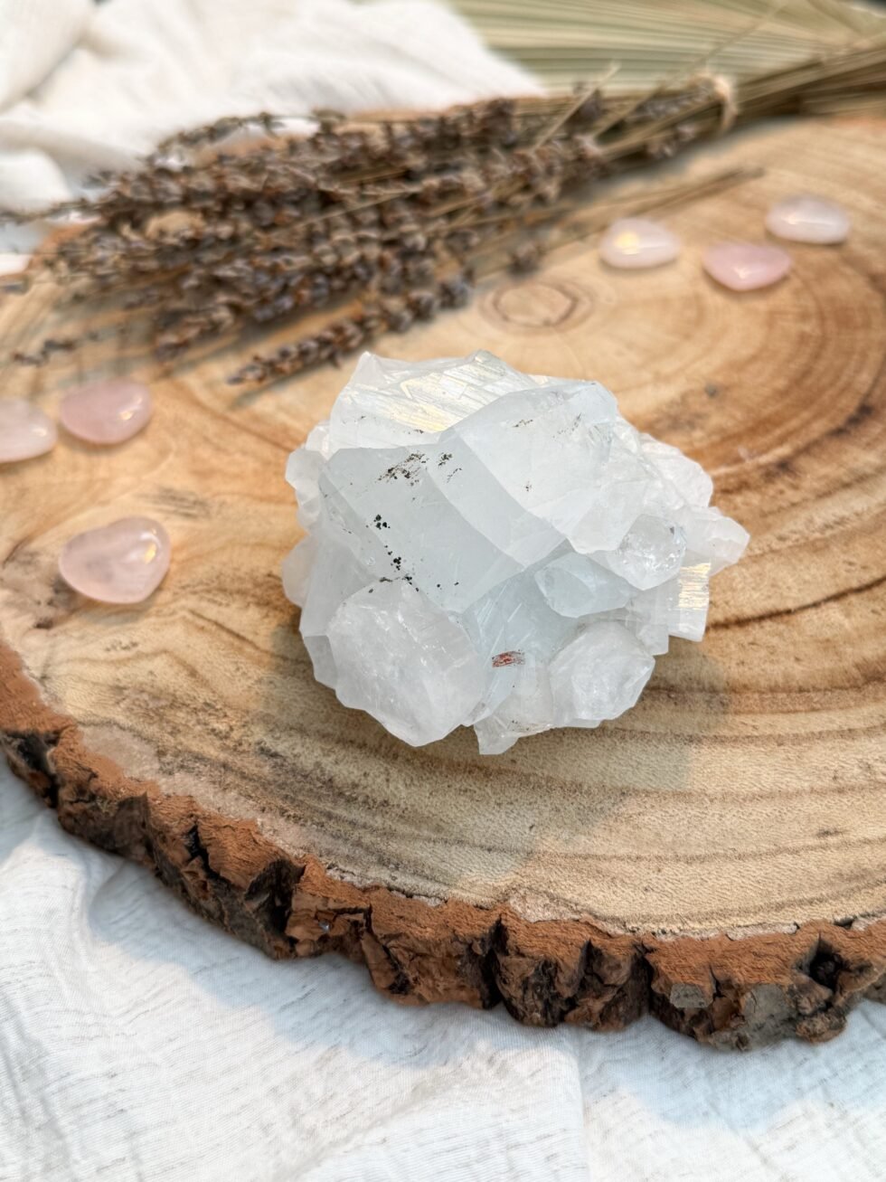 Apophyllite is known for its bright, uplifting energy that clears the mind and opens the heart. With its shimmering natural points and reflective surfaces, this crystal radiates purity and calm. It is often used to bring emotional clarity, ease heaviness, and support deeper connection with intuition and inner peace.
