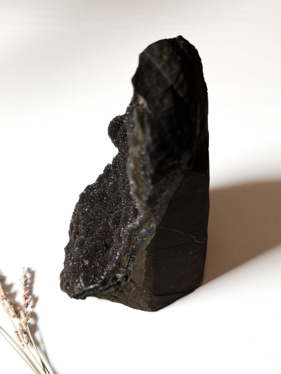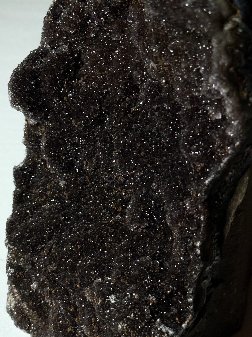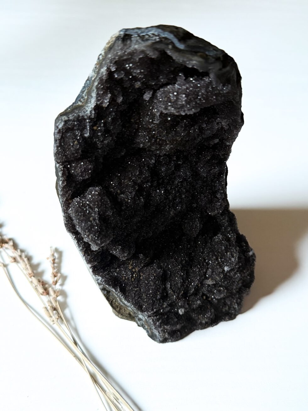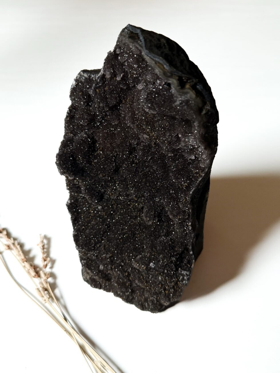 Black amethyst freeform with deep, grounding energy and sparkling druzy formations.
