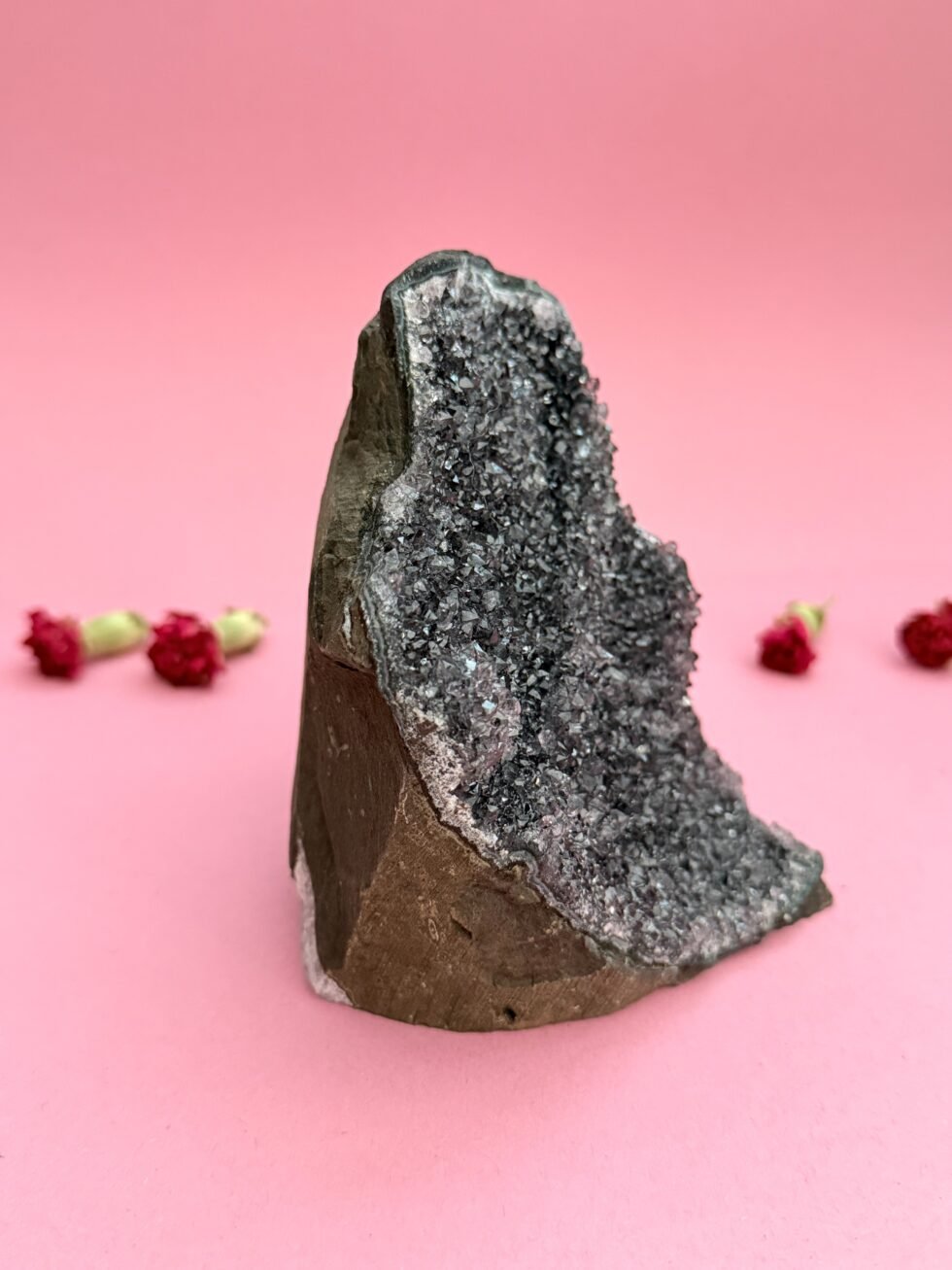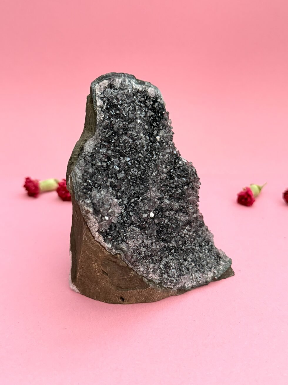 Black amethyst freeform with deep, grounding energy and sparkling druzy formations.
