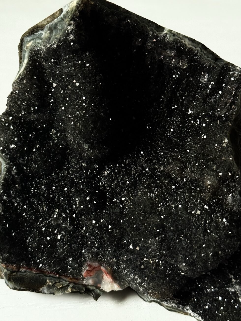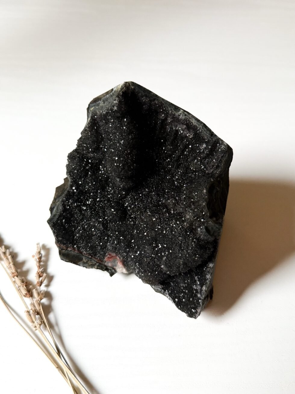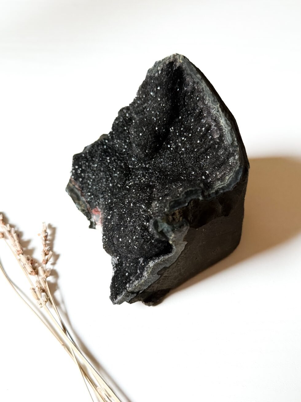 Black amethyst freeform with deep, grounding energy and sparkling druzy formations.