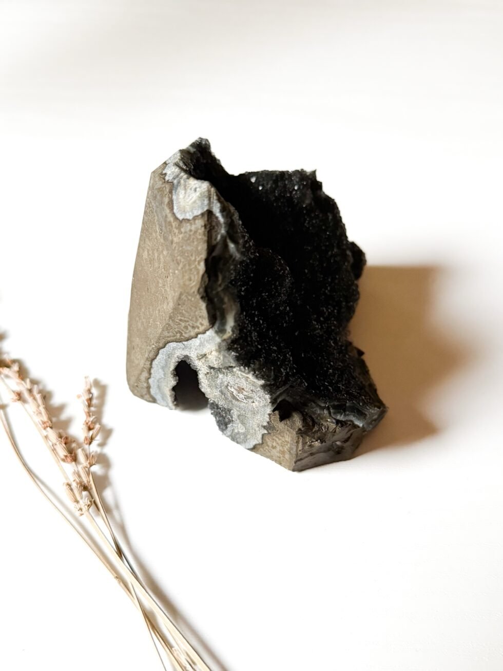 Hand-selected by Faeara for its natural beauty and calming energy, this black amethyst freeform brings a sense of sacred stillness to any space.
