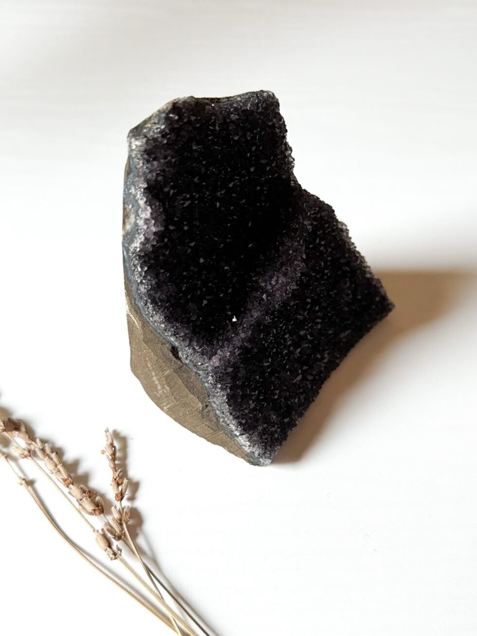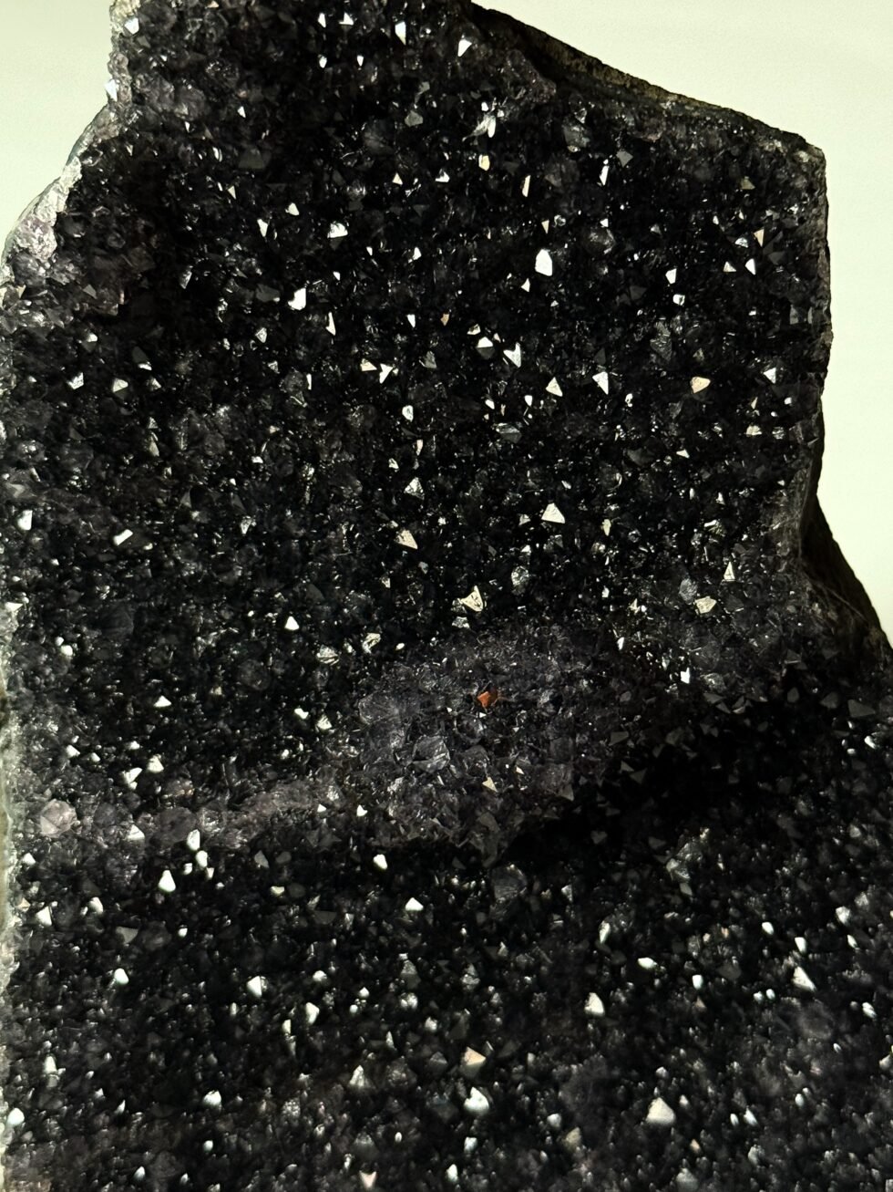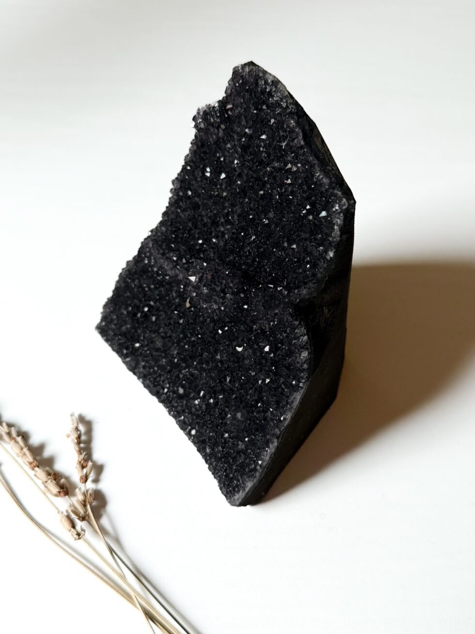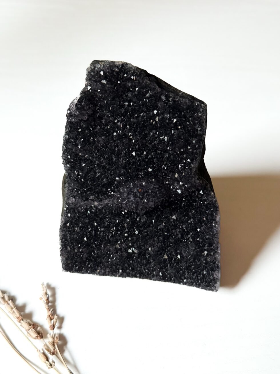 Black amethyst freeform with deep, grounding energy and sparkling druzy formations.
