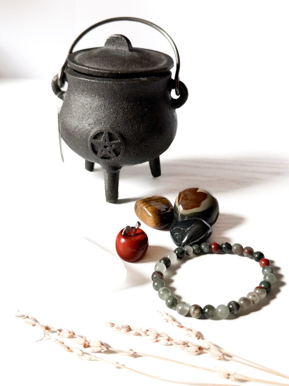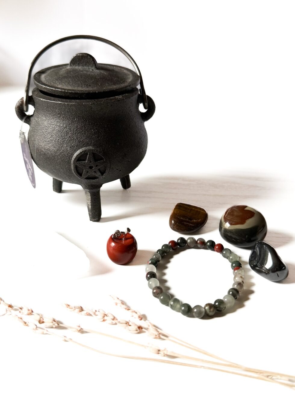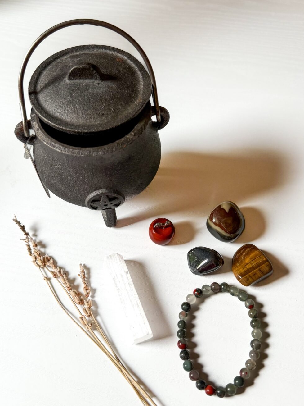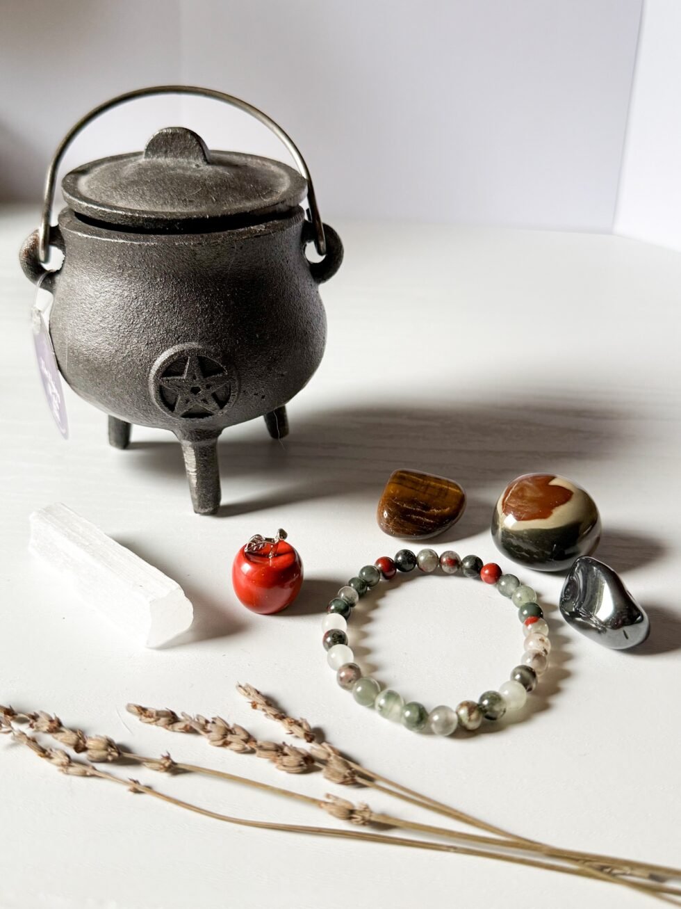Limited-edition Halloween bundle. Each set includes a cast iron cauldron, African bloodstone bracelet, raw selenite stick, red jasper apple, and three tumbles (tiger’s eye, hematite, and polychrome jasper). Only 5 available!