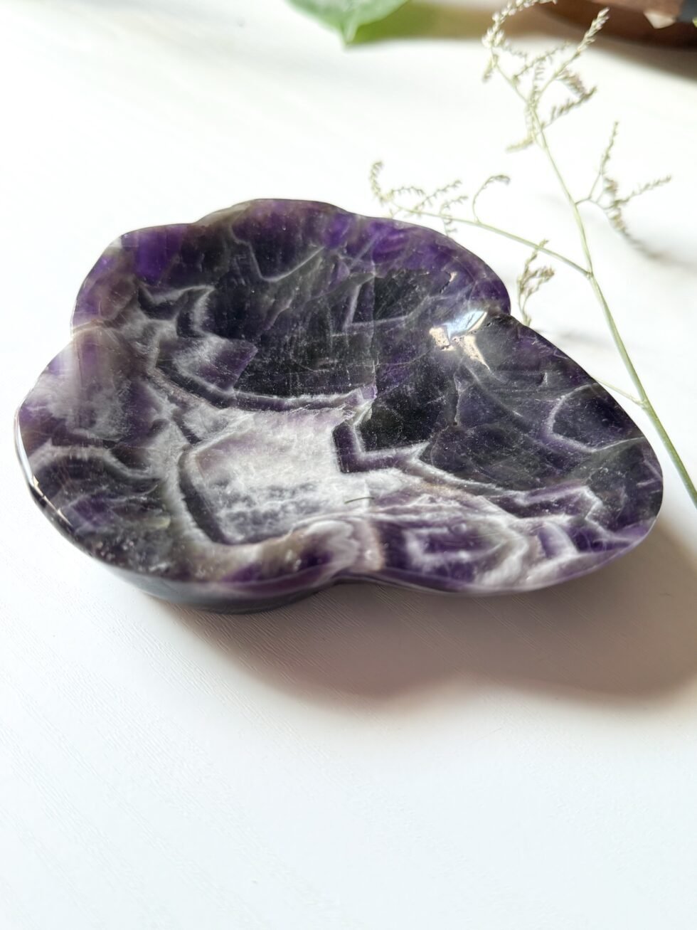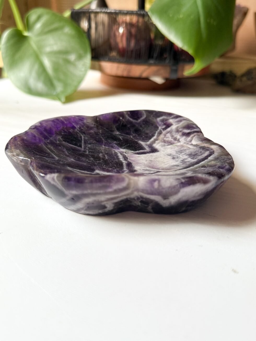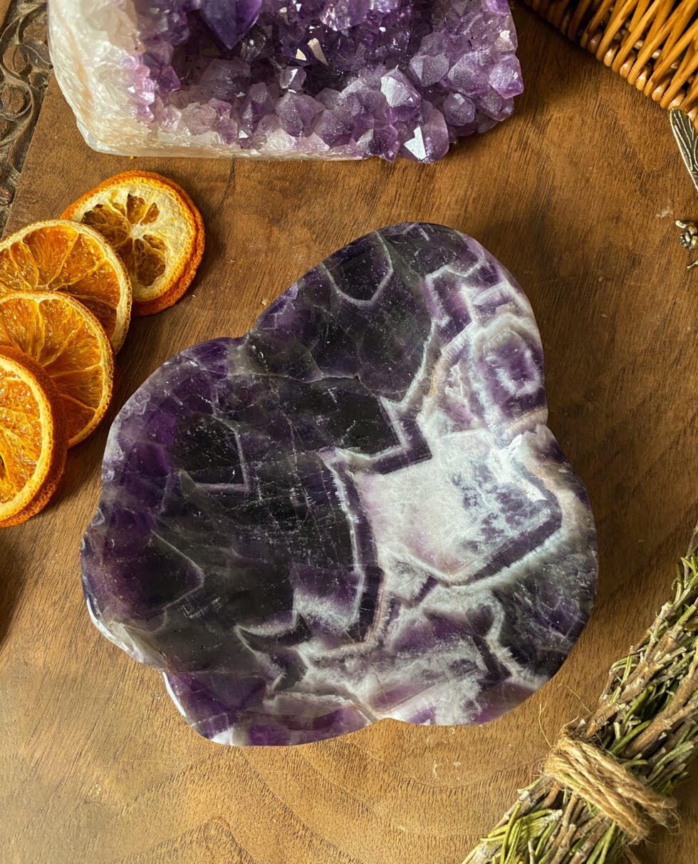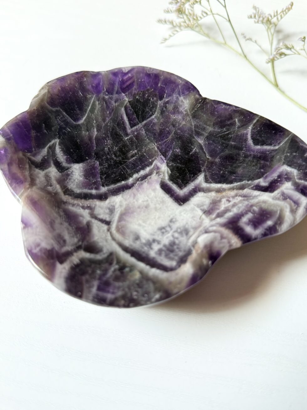 Chevron amethyst bowl combines the deep purple hues of amethyst with the striking white zigzag patterns of quartz, creating a powerful stone of spiritual insight and protection. Chevron amethyst is revered for its ability to clear the mind, enhance intuition, and provide a soothing shield against negative energies.