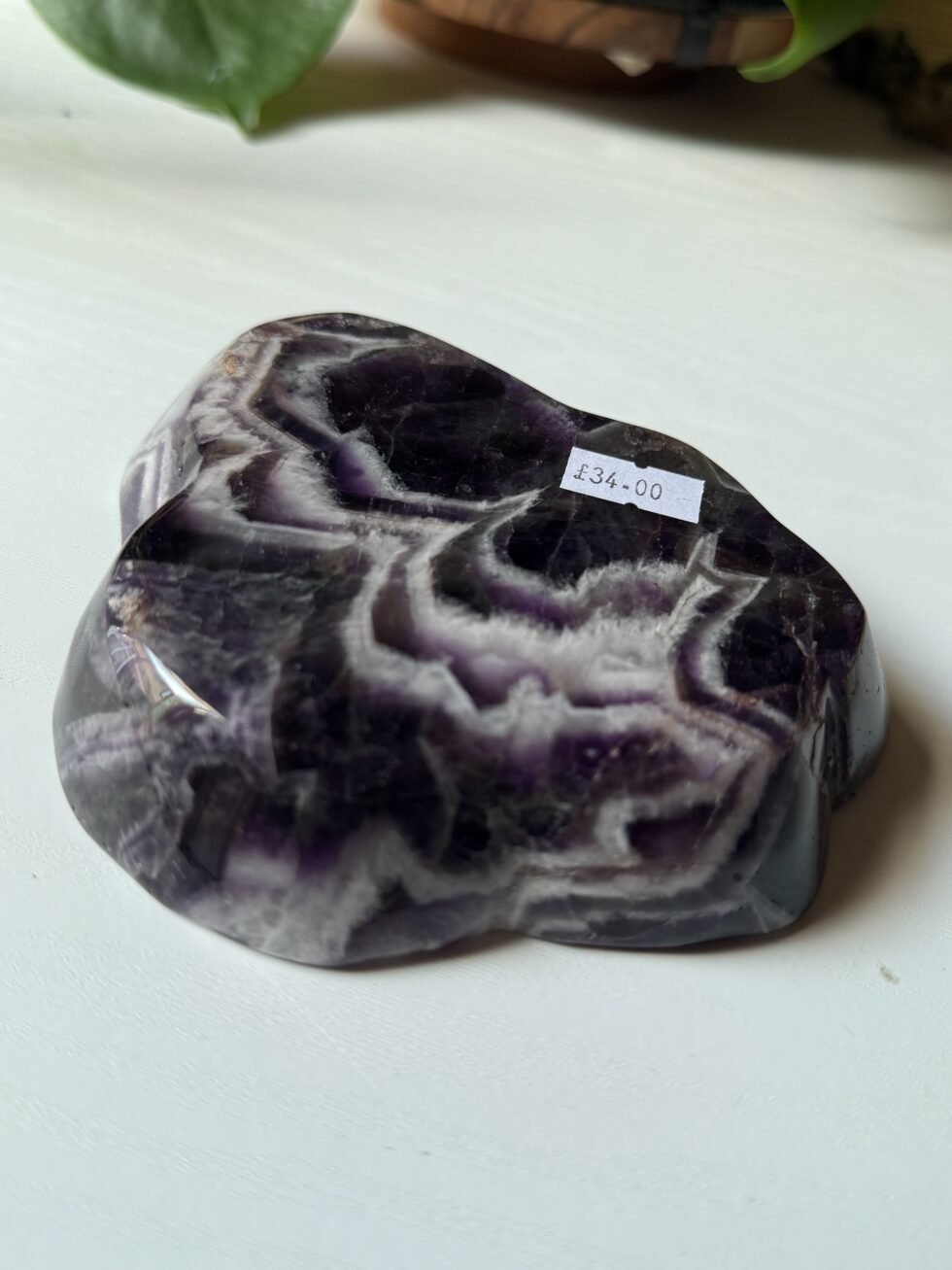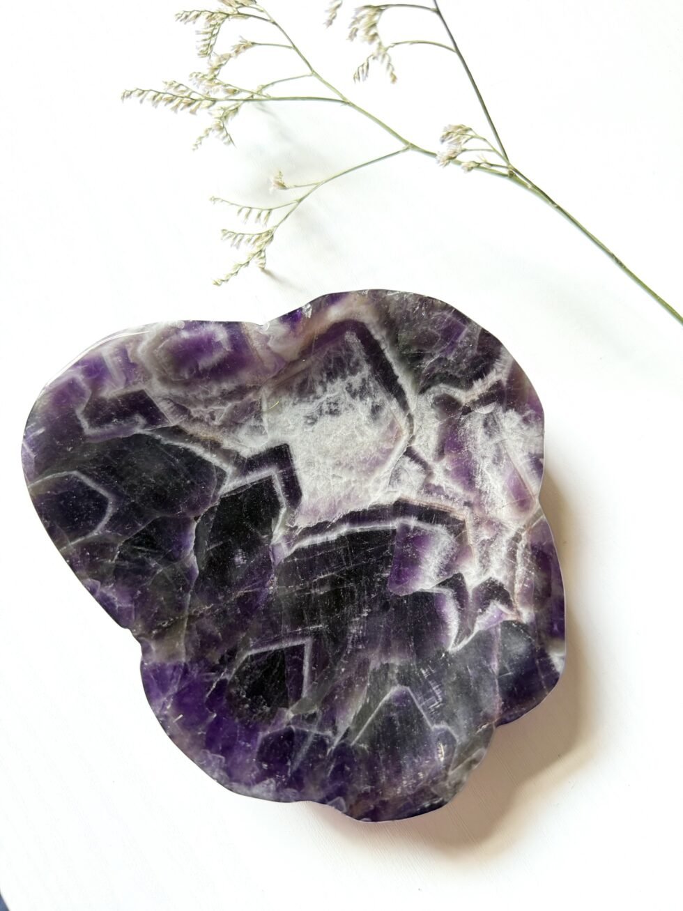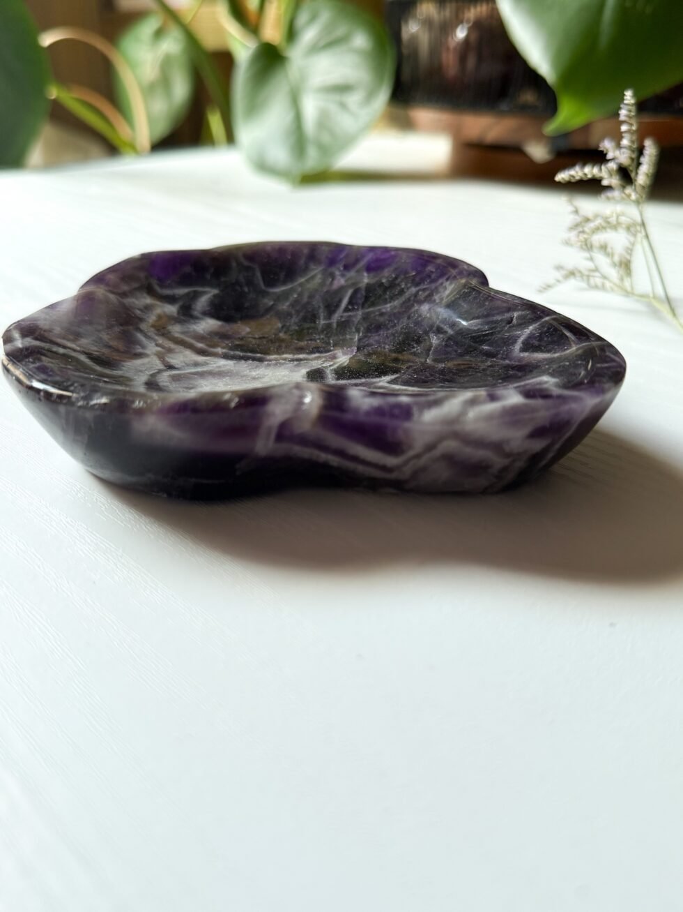Chevron amethyst bowl combines the deep purple hues of amethyst with the striking white zigzag patterns of quartz, creating a powerful stone of spiritual insight and protection. Chevron amethyst is revered for its ability to clear the mind, enhance intuition, and provide a soothing shield against negative energies.