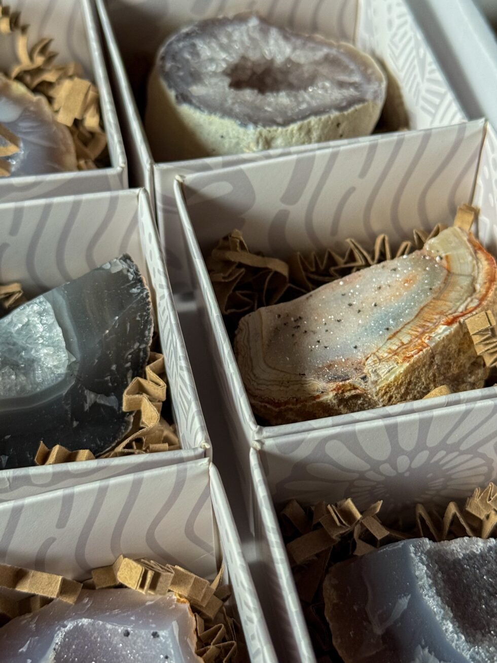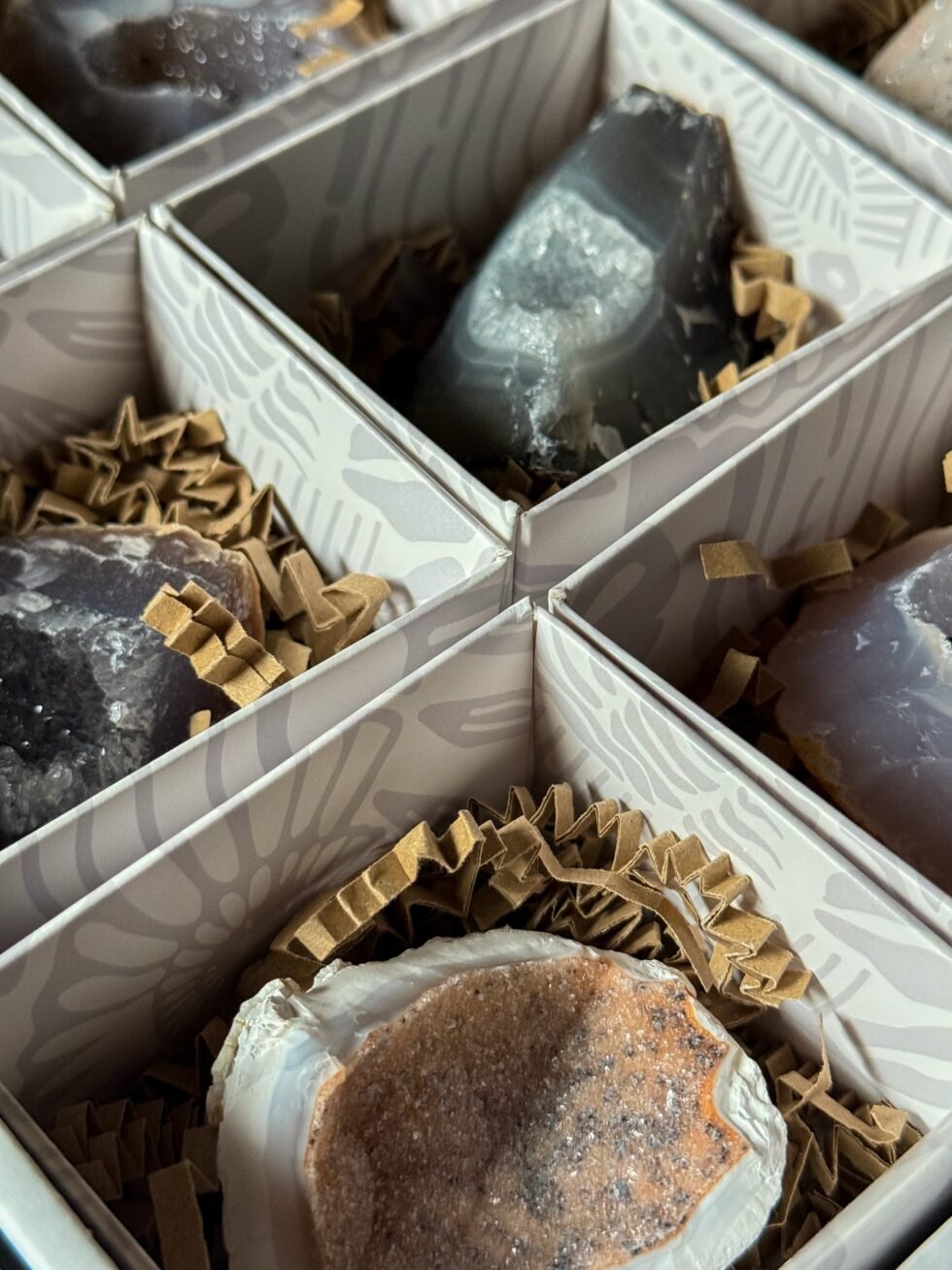 Pick your own Sparkling Druzy Agate geodes. Grounding, emotional balance, and gentle calming energy. Each piece is one-of-a-kind, beautifully gift-boxed for your sacred space or a meaningful present.