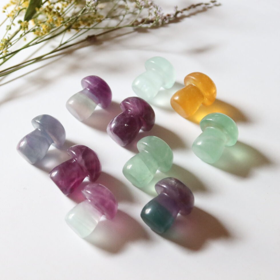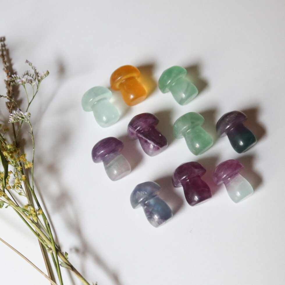 Fluorite mushroom carvings, each intuitively picked just for you. Carved from natural fluorite, these small mushrooms display a stunning range of colours  from soft greens, yellow, blue and purples to subtle banding unique to each piece.