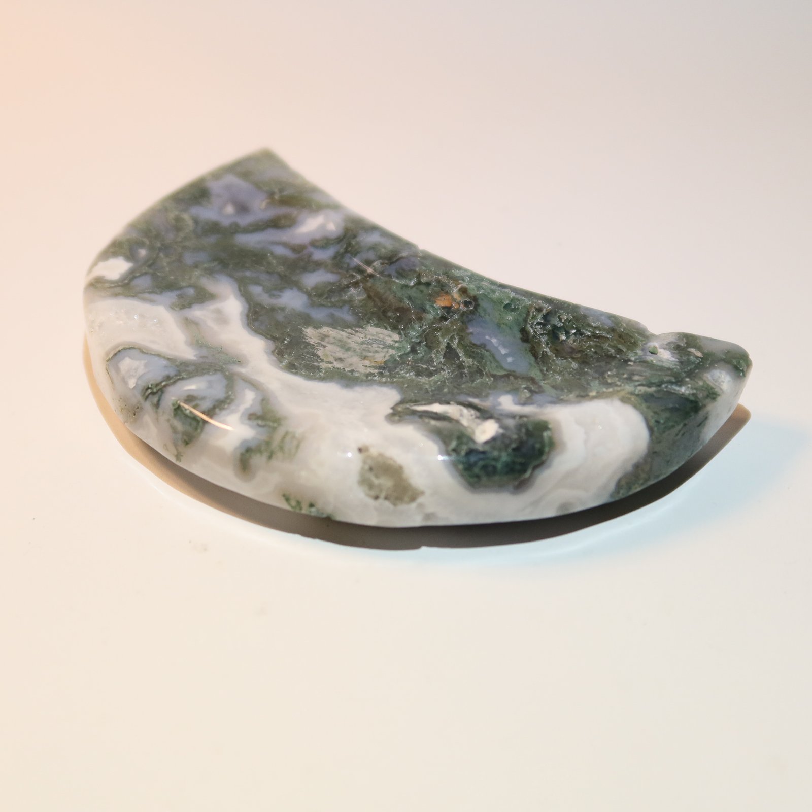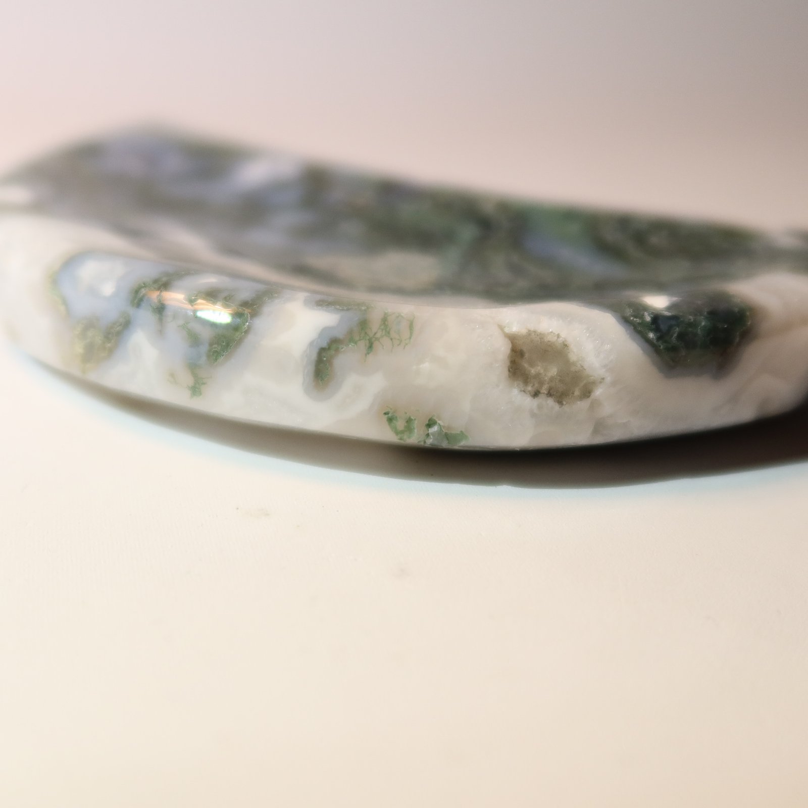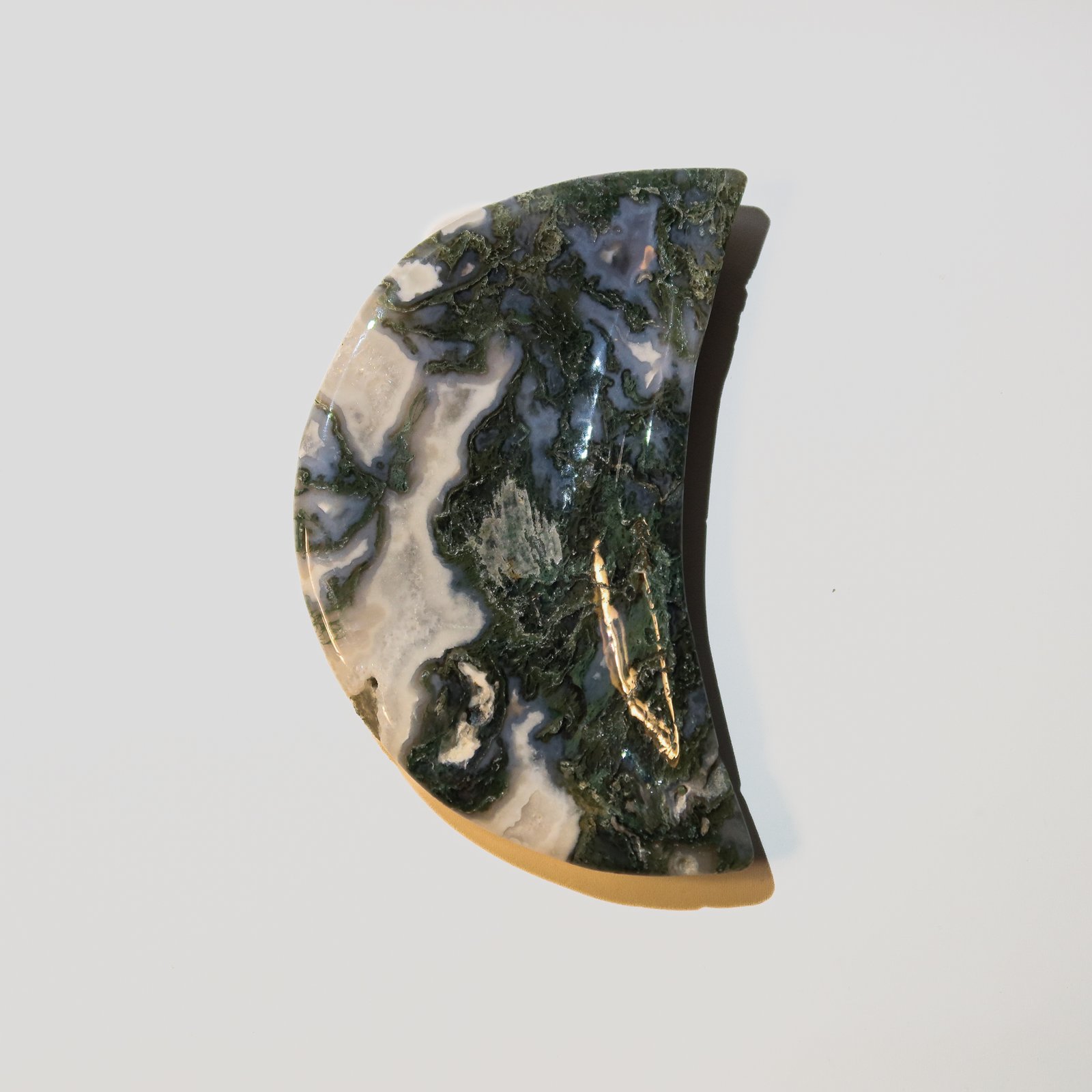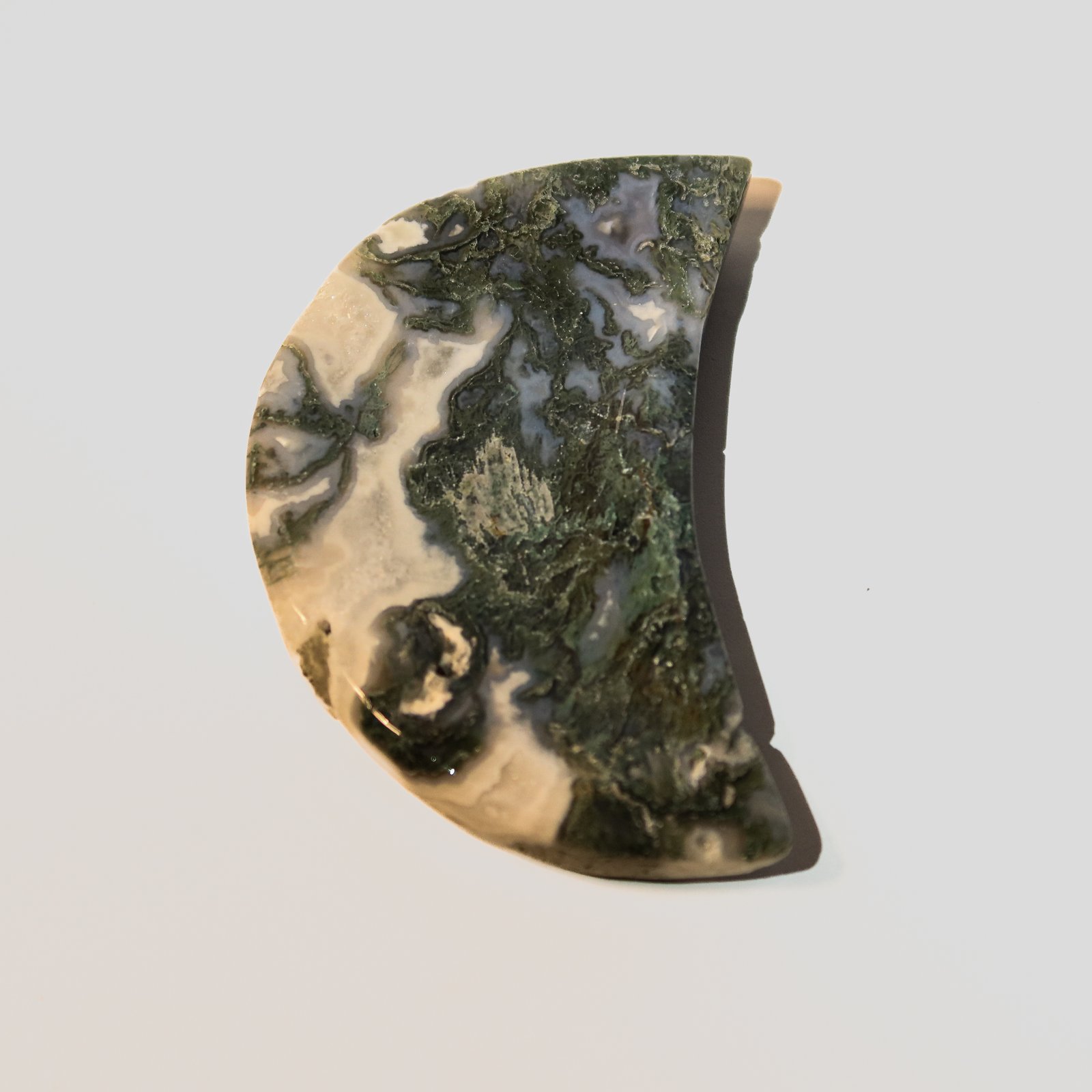 A crescent-shaped moss agate bowl for grounding and harmony.