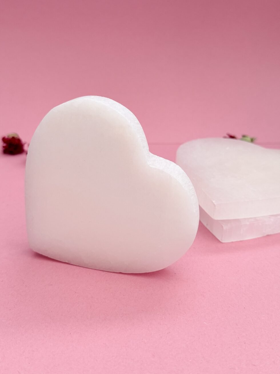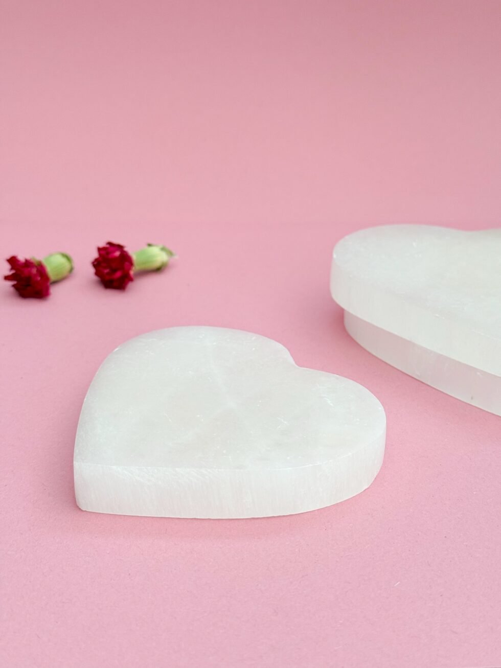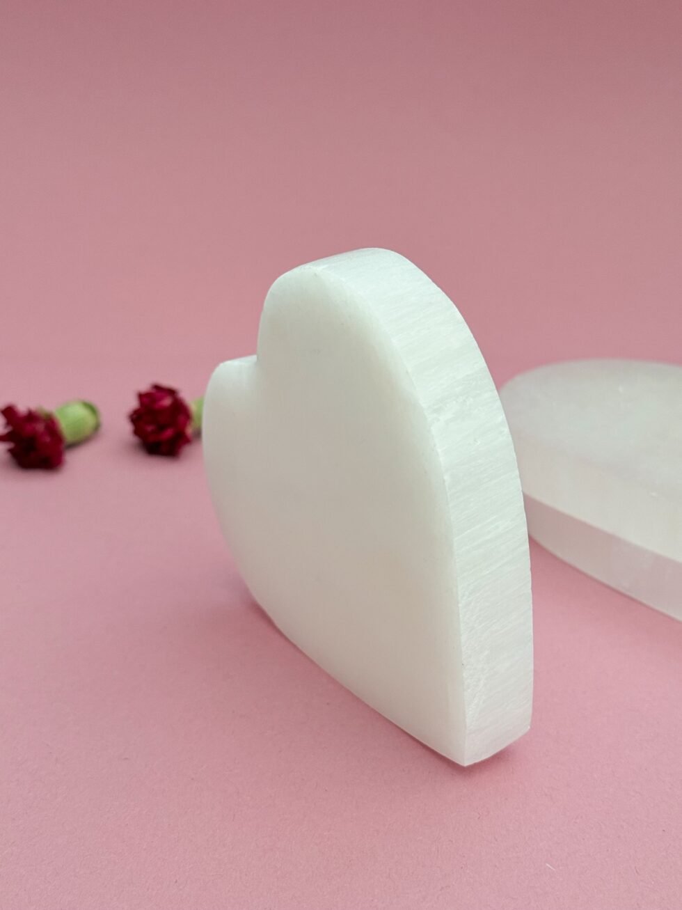 Selenite Heart Charging Plate clears stagnant energy and recharges your crystals, making it a perfect addition to any space.
