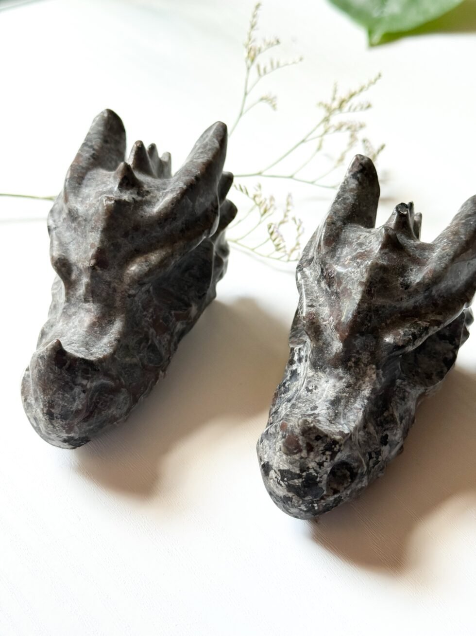 Yooperlite Dragon Head carvings a striking fusion of elemental energy and ancient symbolism. Yooperlite is known for its mesmerising fluorescent glow under UV light, revealing hidden fiery patterns within its cool grey surface. This stone is often associated with transformation and courage, encouraging self-discovery and helping one release fear to embrace inner power.