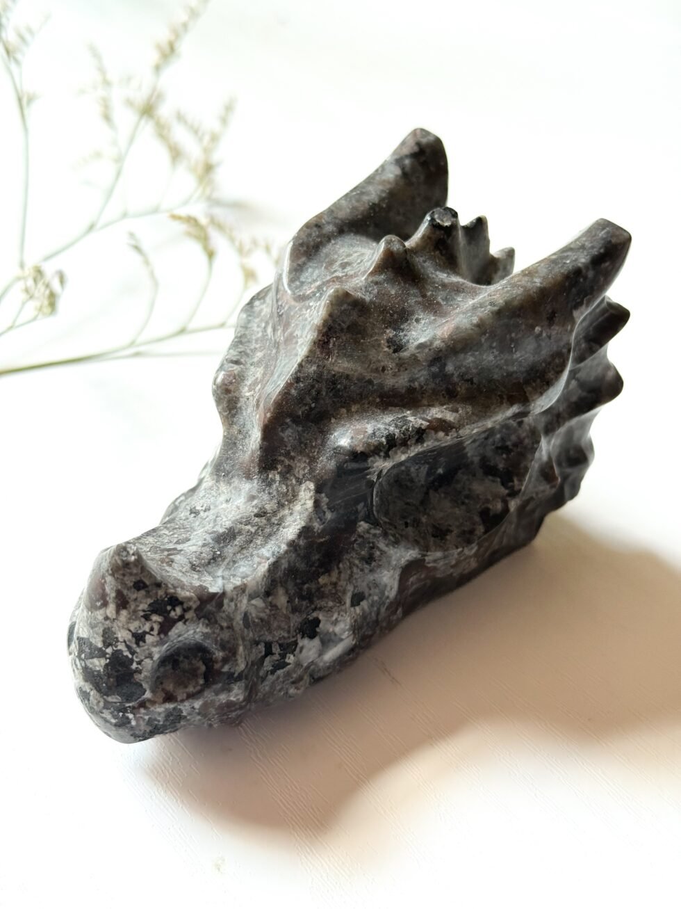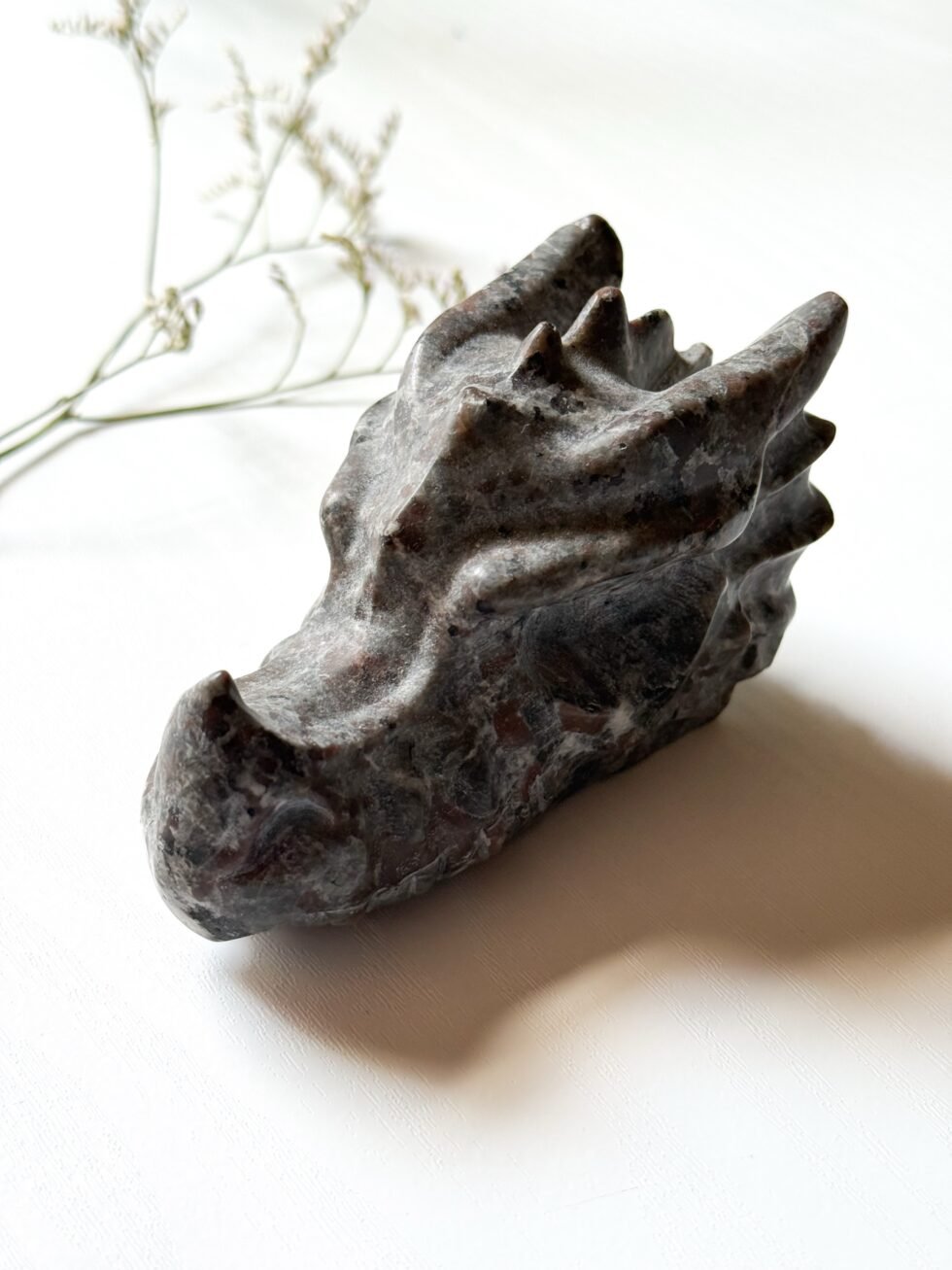 Yooperlite dragon head carving symbolising strength, protection, and transformation.